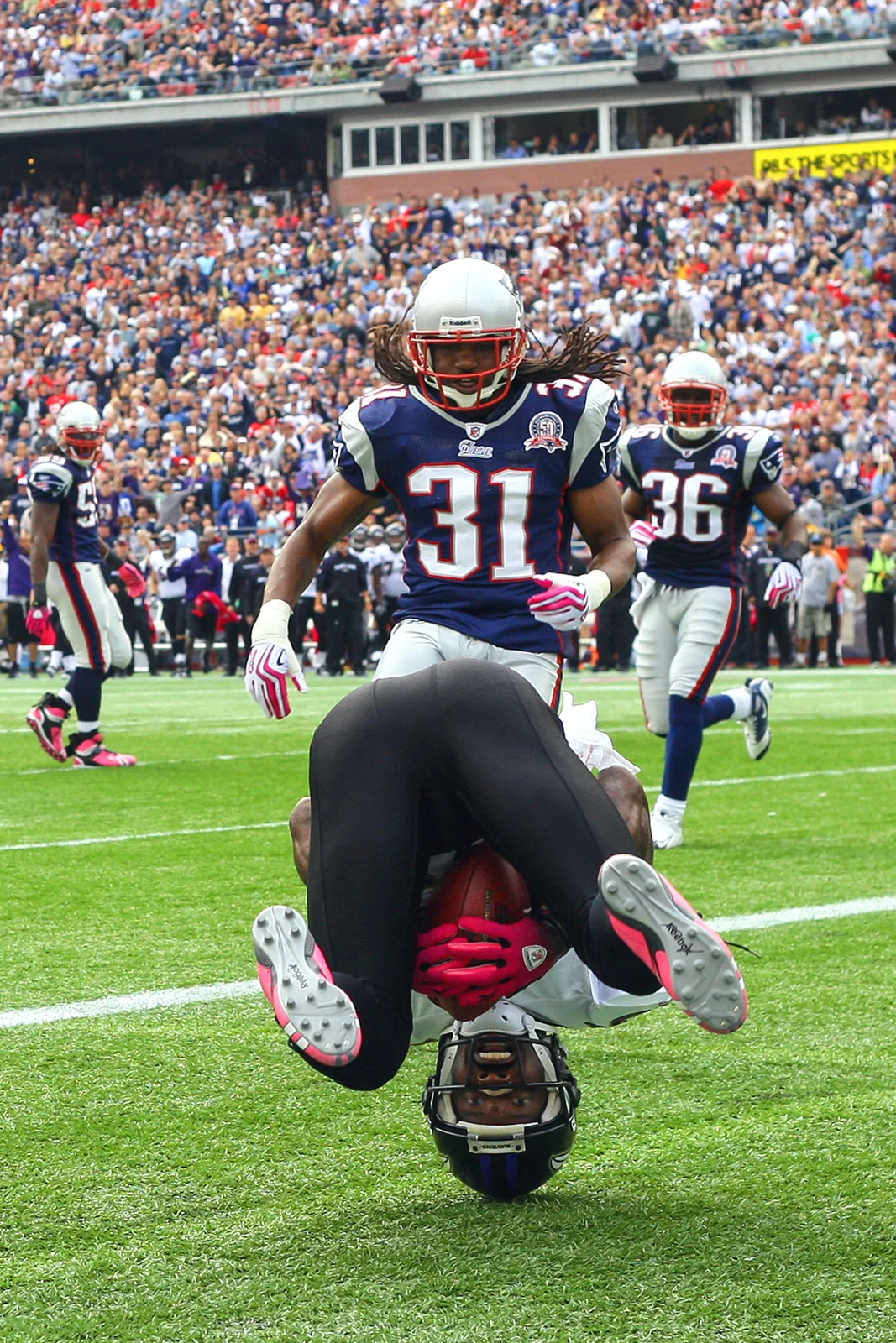 When this photo of Derrick Mason of the Baltimore Ravens happened it was a magical moment. All the photographers were checking the back of their camera and checking it again. It was that unusual and that good. The image was shot with a 50mm f1.8 lens. I’ve always kept a camera with a short lens around my neck pre-focused at a certain distance for something that happens close by. All the planets were aligned and after Mason made the catch, he was upended and landed on his head. The light was pretty flat allowing for detail in his face. It was one of those freak plays where everything worked out.